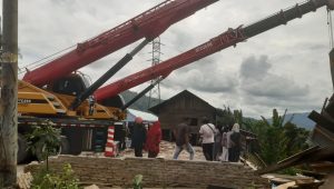 Dua unit mobil crane diturunkan untuk mengangkat mobil truk yang menabrak rumah warga di Dusun Pettal Desa Sukarame Kec. Kerajaan Kab. Pakpak Bharat.