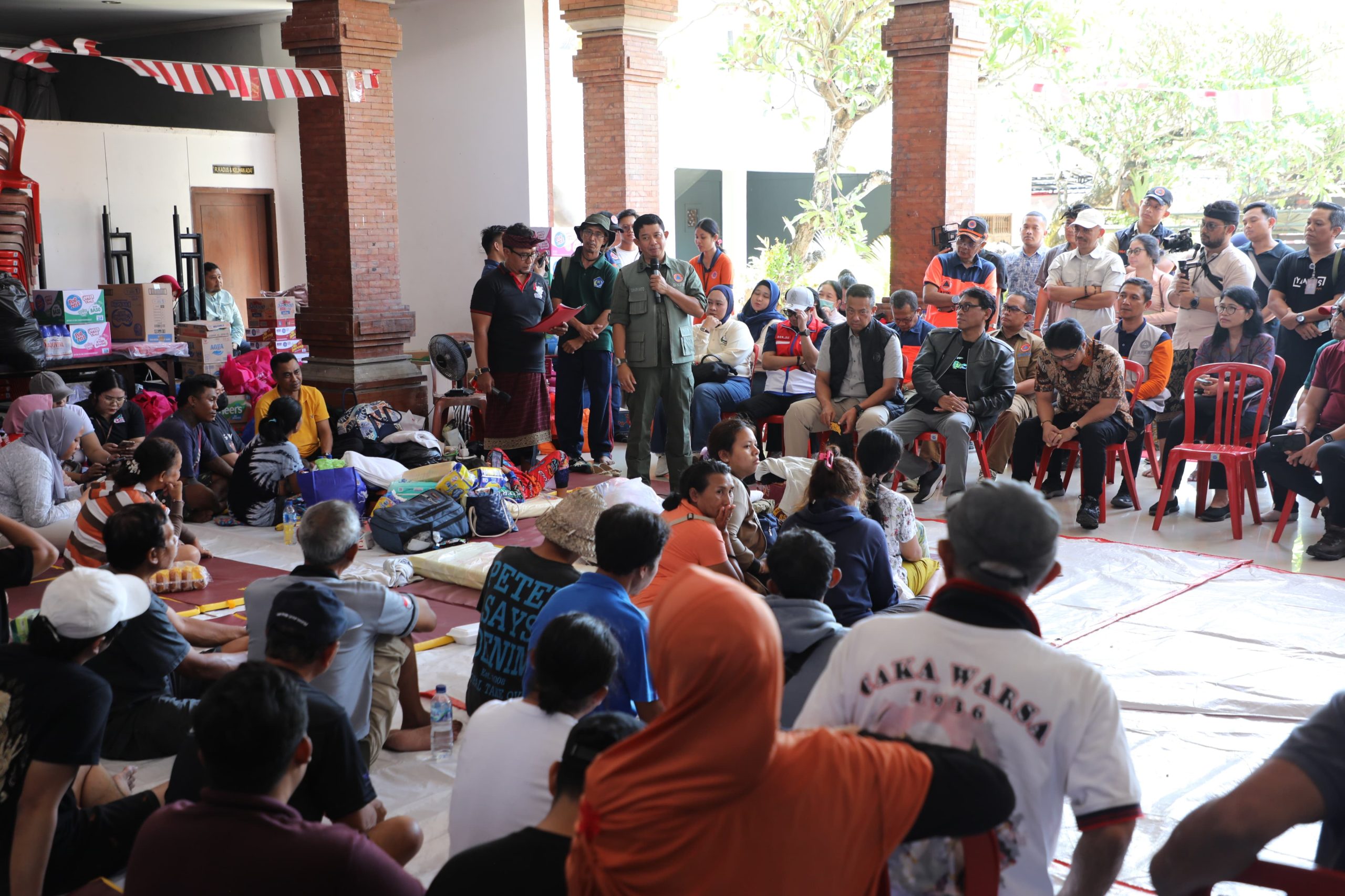 Dalam peninjauan di pos pengungsian Banjar Sedana Mertha Ubung, Suharyanto berdialog dengan warga terdampak dan memastikan bantuan kebutuhan dasar tersedia.