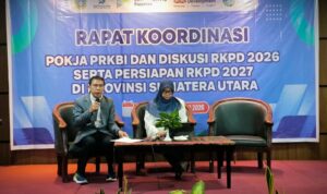 Medan – Badan Perencanaan Pembangunan, Penelitian dan Pengembangan (Bappelitbang) Sumatera Utara bersama Low Carbon Development Indonesia (LCDI) menggelar Rapat Koordinasi Pokja Pembangunan Rendah Karbon dan Berketahanan Iklim (PRKBI) dan Diskusi Rencana Kerja Pemerintah Daerah (RKPD) 2026 serta Persiapan RKPD 2027 di Grand Antares Hotel Medan (25/2/2026).