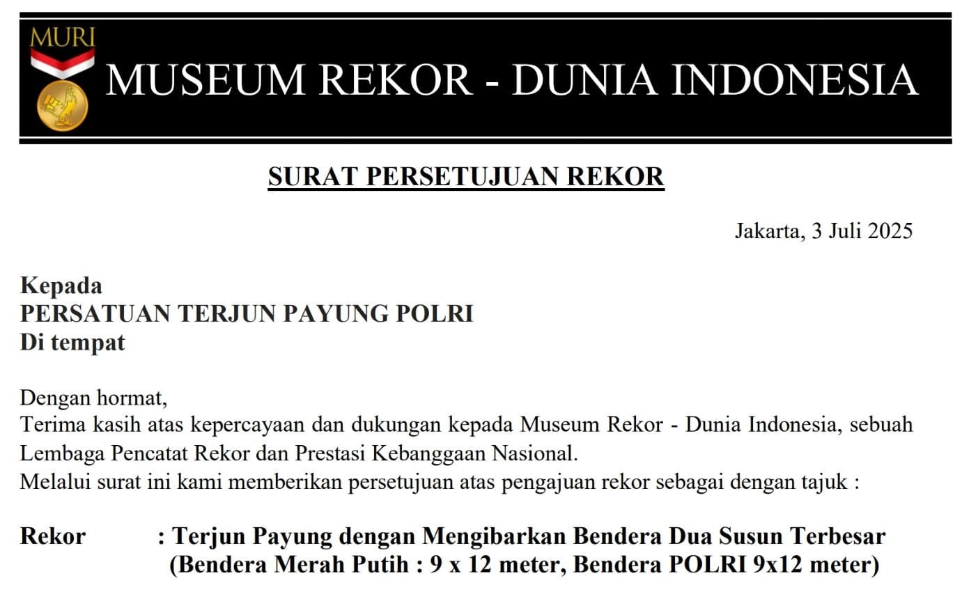 Penetapan rekor nasional tersebut dituangkan dalam Surat Keputusan Nomor: 44/K.Terpa/VI/2025, dan ditandatangani oleh Ketua Komite Terjun Payung FASI, Irvan Zuladry, pada 24 Juni 2025 di Jakarta. (SC03)