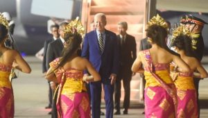 Selepas turun dari pesawat, Presiden Biden disambut oleh tarian khas Bali. Presiden Biden kemudian berjalan menuju rangkaian kendaraan yang telah disiapkan dan segera meninggalkan bandara.