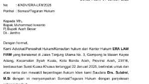 Somasi tertuang dalam surat bernomor 4/ADV/ERA-LF/I/2025 perihal Somasi/Teguran Hukum yang ditujukan kepada Pj Bupati Aceh Besar.