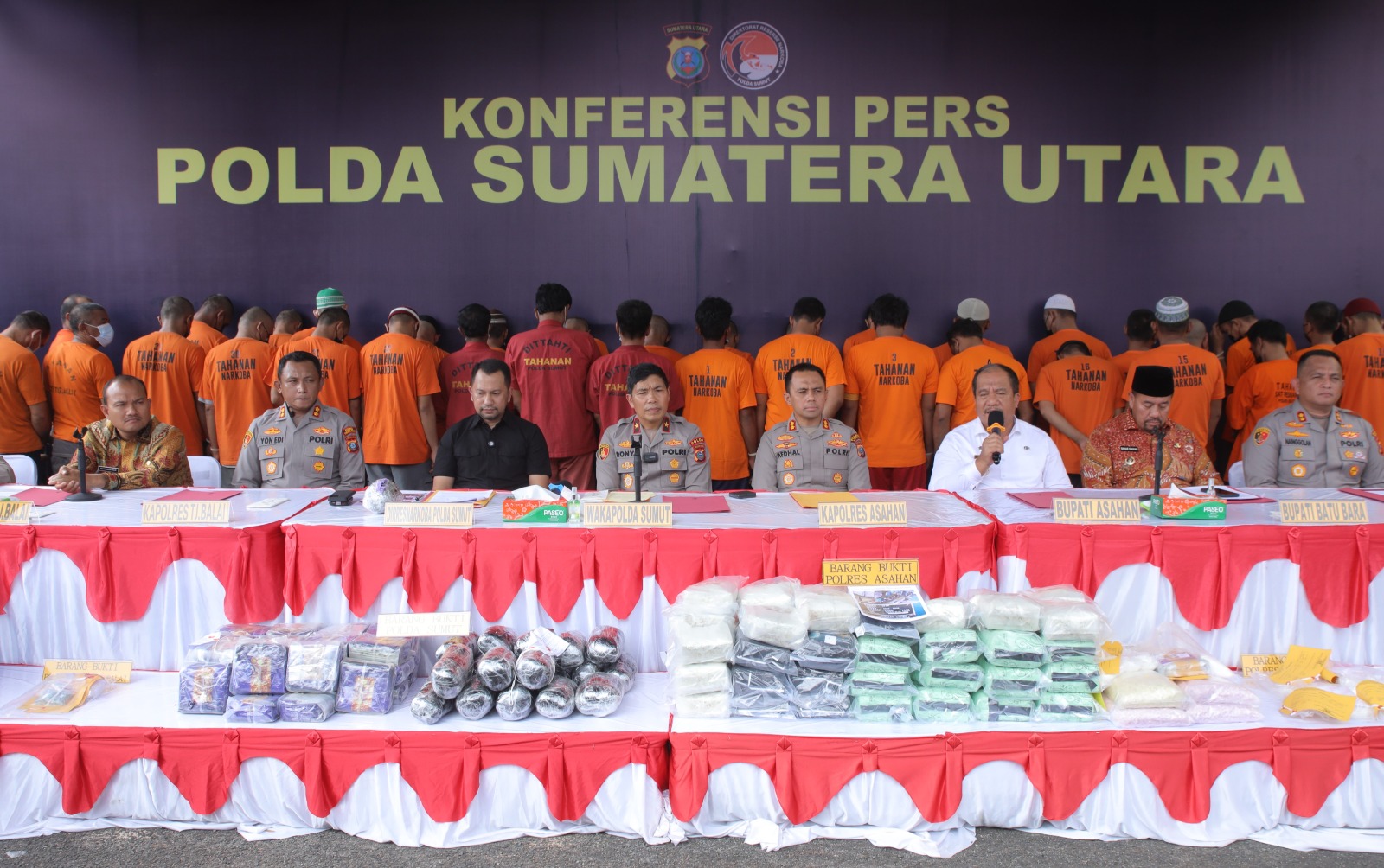 Pengungkapan kasus tersebut tampak hadir Dirresnarkoba Polda Sumatera Utara, Bupati Batubara, Walikota Tanjung Balai, Kapolres Asahan, Kapolres Batubara dan Kapolres Tanjung Balai. (SC-Denny)