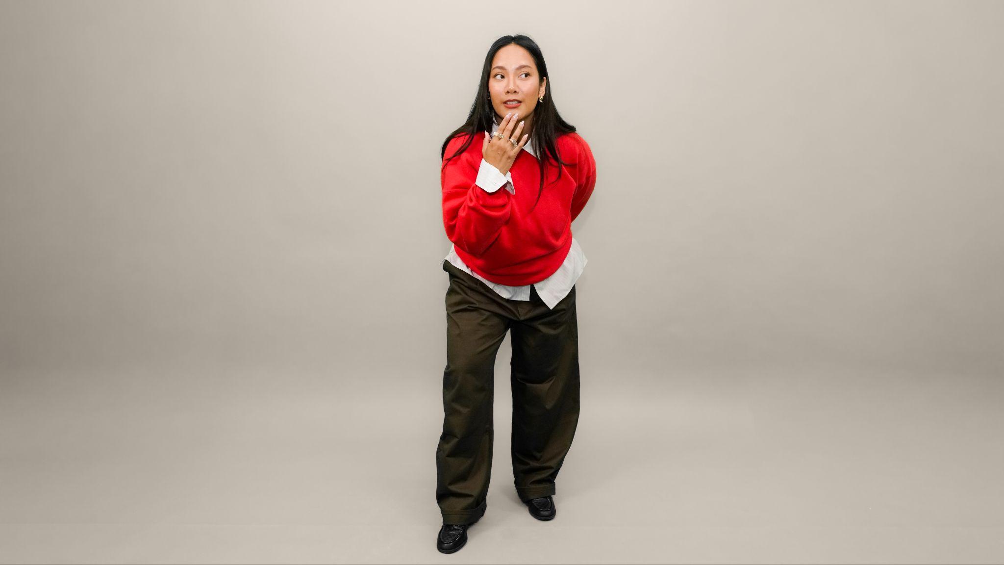 Pada tampilan Elevated Casual Contrast, Tara Basro menghadirkan ekspresi diri yang lebih kuat melalui padu padan warna dan siluet yang tegas, namun tetap terasa fungsional dan membumi. Celana Barel berwarna coklat memberikan struktur sekaligus keleluasaan bergerak, dipadukan dengan Kemeja Broadcloth Oversize Lengan Panjang yang versatile, lalu dilapis Sweater Katun Lembut Kerah Bulat berwarna merah sebagai aksen kontras yang tampil menonjol tanpa terasa berlebihan. Tampilan ini mencerminkan perjalanan Tara dalam memaknai emansipasi sebagai keberanian untuk menentukan pilihan bagi dirinya sendiri termasuk dalam cara berpakaian. Bukan untuk memenuhi ekspektasi, melainkan untuk menghadirkan versi dirinya yang paling jujur, nyaman, dan percaya diri dalam menjalani keseharian.