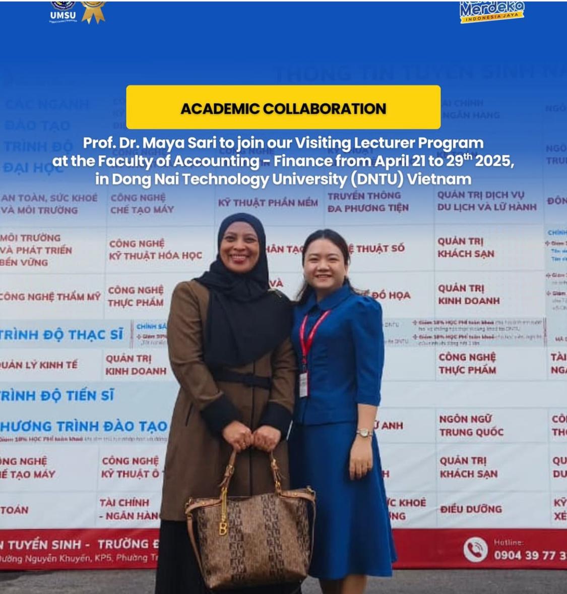Medan – Dosen Universitas Muhammadiyah Sumatera Utara (UMSU), Prof. Dr. Maya Sari, M.Si., CA., yang baru saja dikukuhkan sebagai profesor dalam bidang akuntansi pada tahun 2025 ini, diundang sebagai Visiting Lecturer di Dong Nai Technology University (DNTU), Vietnam. Ia merupakan salah satu dosen unggulan UMSU yang saat ini juga menjabat sebagai Sekretaris Program Magister Akuntansi di Fakultas Ekonomi dan Bisnis. Kegiatan akademik ini berlangsung pada 20–30 April 2025.