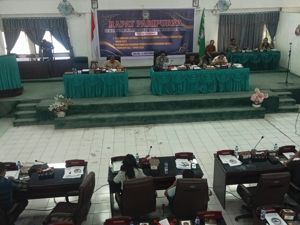 Toba – Dewan Perwakilan Rakyat Daerah (DPRD) Kabupaten Toba menggelar rapat paripurna dalam rangka penyampaian laporan hasil Reses II Tahun 2025 serta Program Pembentukan Peraturan Daerah (Propemperda) Tahun 2026. Rapat berlangsung di ruang paripurna DPRD Toba, Kamis (13/11/2025).