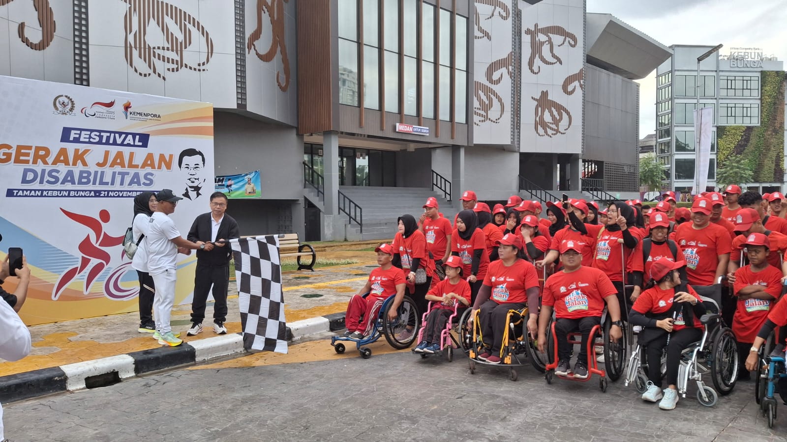 Baju yang basah di badan, tak menyurutkan langkah. Disiplin, kompak, semangat dan penuh keceriaan, itulah kesan yang muncul ketika melihat ratusan peserta disabilitas hadir dalam acara Festival Gerak Jalan Disabilitas yang digelar Kementerian Pemuda dan Olahraga (Kemenpora) dan Komisi X DPR RI bekerjasama dengan National Paralympic Committee (NPC) Sumut di Kebun Bunga, Medan, Jumat (21/11).