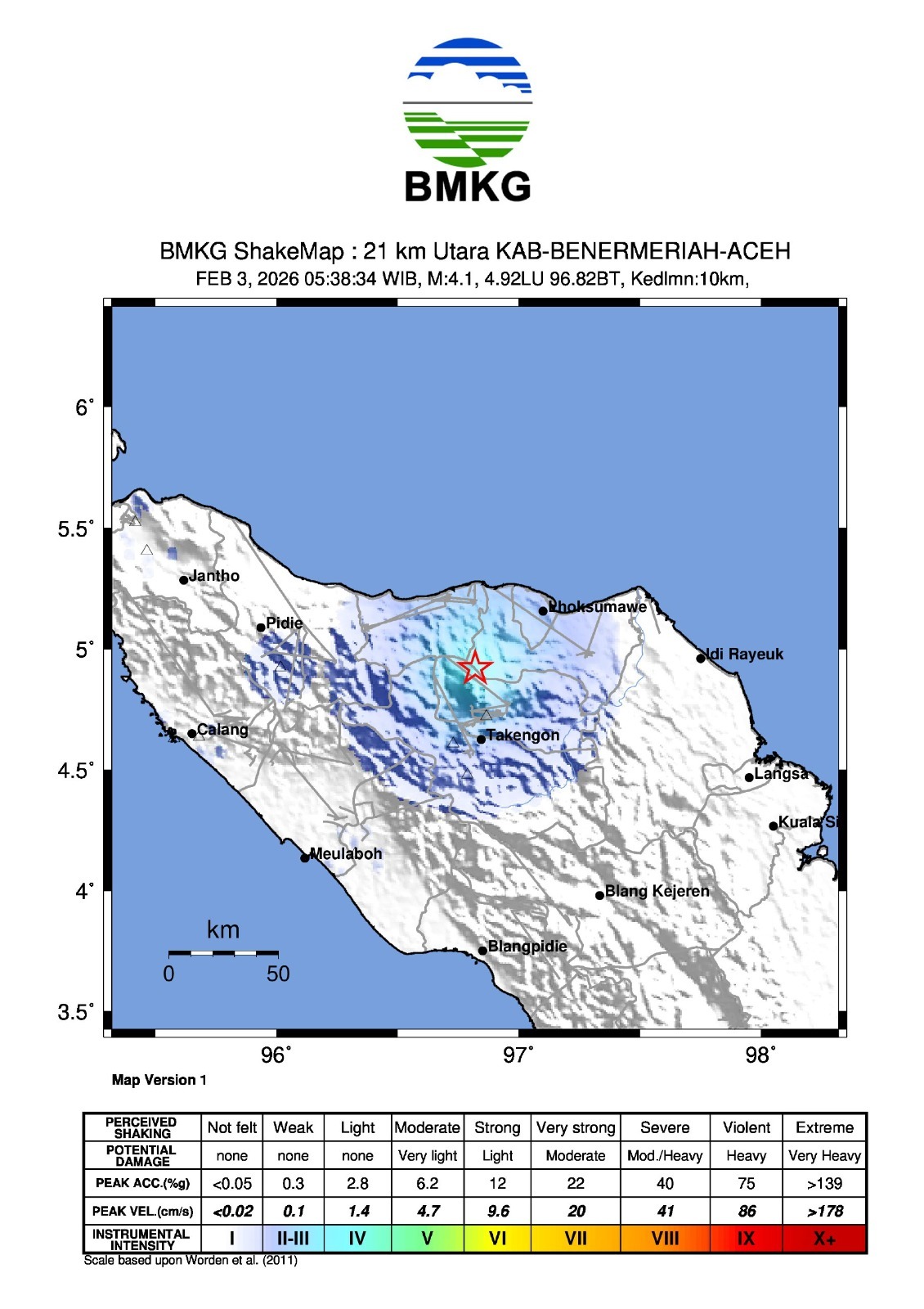 Medan – Kabupaten Bener Meriah dan sekitarnya diguncang gempabumi tektonik pada Selasa, 3 Februari 2026 pukul 05:38:34 WIB. Hasil analisis BMKG (Badan Meteorologi Klimatologi dan Geofisika) menunjukkan, gempabumi ini memiliki parameter update dengan magnitudo M3.9. Episenter gempabumi terletak pada koordinat 4.92° LU dan 96.78° BT, atau tepatnya berlokasi di darat pada jarak 23 km Barat Laut Kab-Benermeriah-Aceh pada kedalaman 10 km.