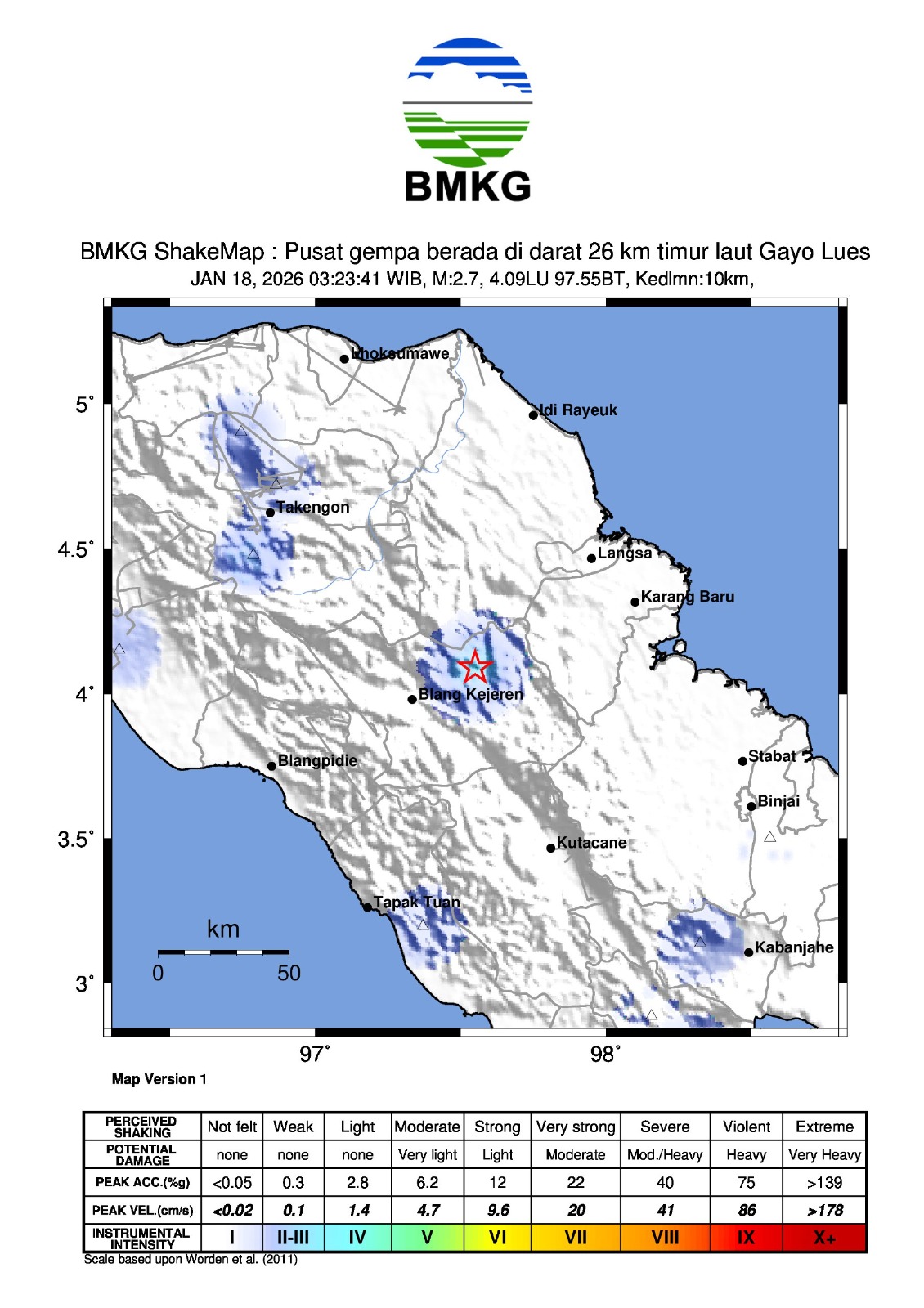 Medan – Minggu, 18 Januari 2026 pukul 03:23:41 WIB, Kabupaten Gayo Lues dan sekitarnya diguncang gempabumi tektonik. Hasil analisis BMKG menunjukkan bahwa gempabumi ini memiliki parameter update dengan magnitudo M4.3.
