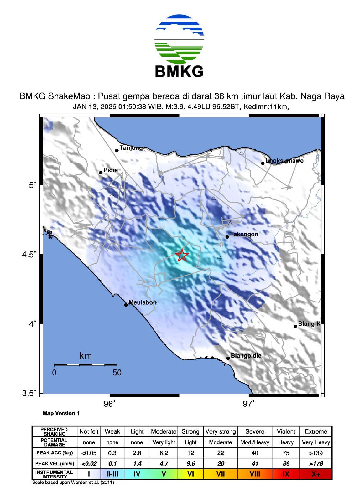 Medan – Kabupaten Aceh Tengah dan sekitarnya diguncang gempabumi tektonik pada Selasa (13/1/2026) pukul 01:50:38 WIB. Hasil analisis BMKG menunjukkan, gempa bumi ini memiliki parameter update dengan magnitudo M4.2.