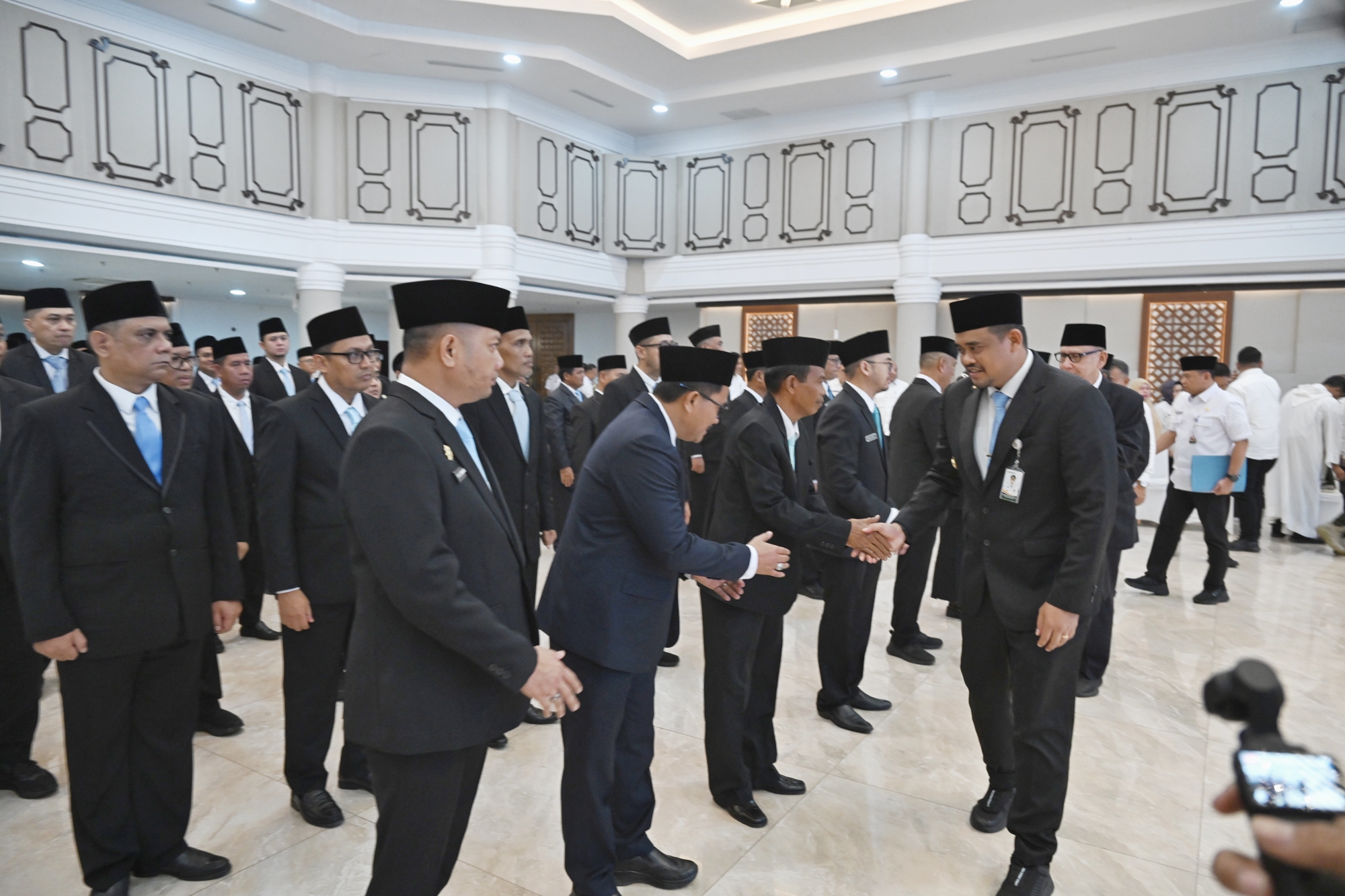 Medan – Gubernur Sumatera Utara (Sumut) Muhammad Bobby Nasution melantik 177 pejabat Administrator dan Pengawas di lingkungan Pemerintah Provinsi (Pemprov) Sumut. Bobby berpesan kepada para pejabat yang dilantik, agar tetap menjaga kekompakan dan berkolaborasi dalam mendukung visi dan misi pemerintah pusat, provinsi, dan kabupaten.