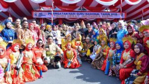 Surabaya – Menteri Pendidikan Dasar dan Menengah (Mendikdasmen), Abdul Mu’ti, menjadi pembina upacara peringatan Hari Guru Nasional Tahun 2025 dengan tema “Guru Hebat, Indonesia Kuat” yang diselenggarakan di Balai Kota Surabaya, Selasa (25/11). Pada kesempatan ini, Menteri Mu’ti mengenakan pakaian adat Bali yang dilengkapi dengan udeng dan kain khas Bali. Upacara yang dihadiri 1000 peserta dari unsur guru, tenaga kependidikan, peserta didik, serta perwakilan pemerintah daerah tersebut berlangsung khidmat sebagai bentuk penghargaan terhadap dedikasi guru di seluruh Indonesia.