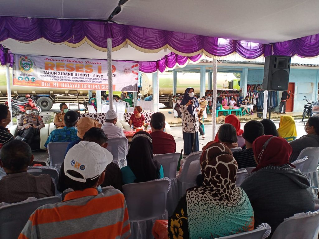 Sumutcyber.com, Simalungun – Anggota Dewan Perwakilan Rakyat Daerah (DPRD) Provinsi Sumatera Utara Dra Hj. Hidayah Herlina Gusti melaksanakan Reses 1 Tahun Sidang III 2021-2022 dalam rangka menampung aspirasi masyarakat Kecamatan Girsang Sipangan Bolon, Kabupaten Simalungun.