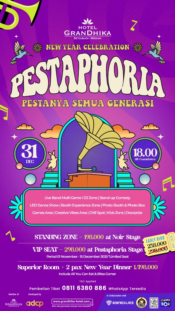 Medan – Menyambut pergantian tahun 2025 menuju 2026, Hotel Grandhika Setiabudi Medan mempersembahkan PESTAPHORIA, sebuah pesta malam tahun baru spektakuler bertema “Pestanya Semua Generasi”. Acara ini akan digelar pada 31 Desember 2025, mulai pukul 18.00 WIB hingga hitung mundur menuju 2026.