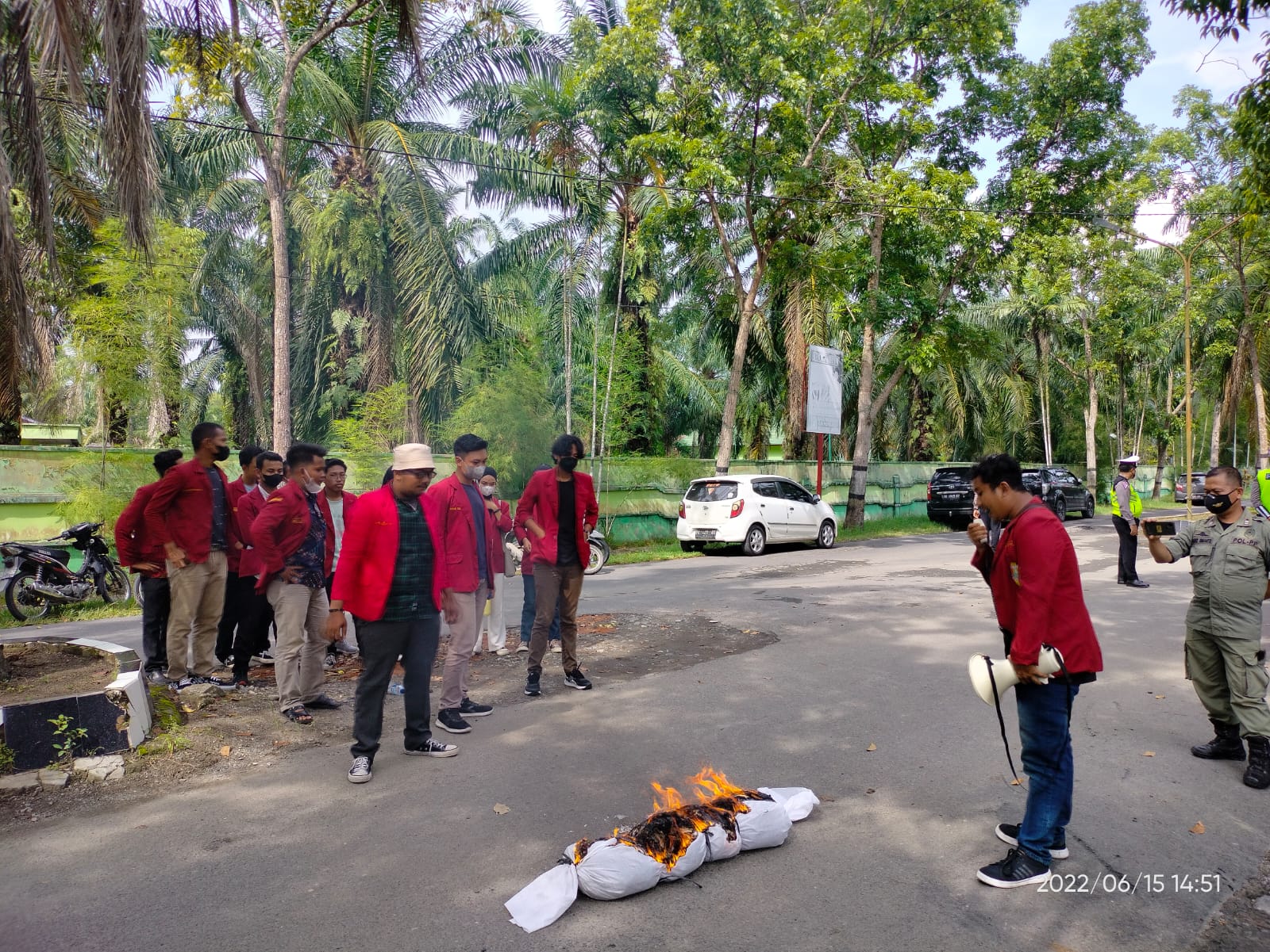 Adapun aksi yang dilakukan mahasiswa di depan Kantor Dinas Pemberdayaan Masyarakat Desa (PMD) Kabupaten Langkat, dengan membawa boneka berbentuk pocong hingga membakar boneka tersebut, Rabu (15/6/2022) sekira pukul 14.45 WIB.