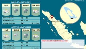 Siang Hari: Berawan dan berpotensi hujan ringan hingga Lebat di wilayah Langkat, Binjai, Deli Serdang, Medan, Serdang Bedagai, Karo, Dairi, Sergai, Pakpak Bharat, Tapteng, Tapsel, Taput, Simalungun, Samosir, Humbahas, Kep. Nias, dan sekitarnya.