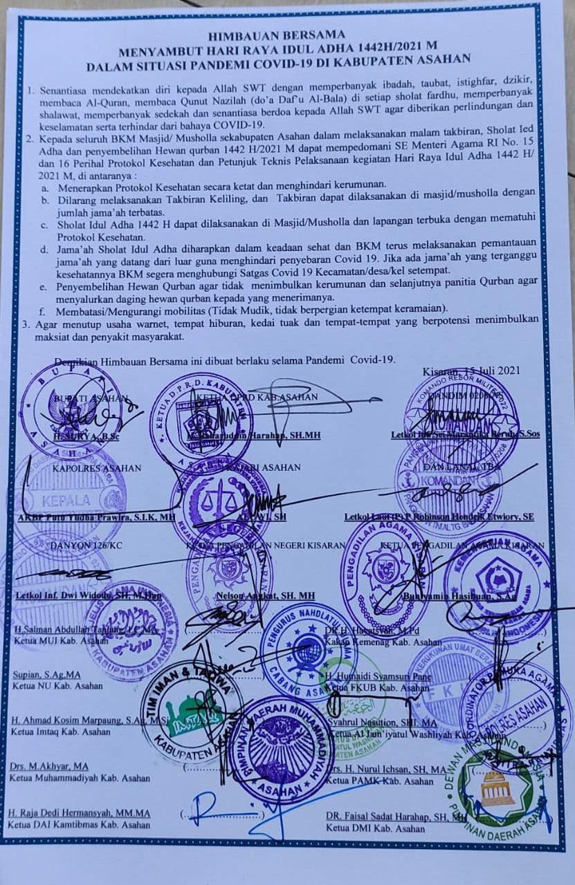 Sumutcyber.com, Kisaran – Forkopimda Kab. Asahan bersama tokoh agama mengeluarkan imbauan dalam menghadapi perayaan Iduladha 1442 H di tengah pandemi Covid-19.
