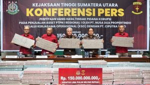 Medan – Kejaksaan Tinggi Sumatera Utara (Kejati Sumut) menyita uang senilai Rp150 miliar yang merupakan hasil pengembalian kerugian keuangan negara dalam perkara dugaan tindak pidana korupsi penjualan aset PT Perkebunan Nusantara (PTPN) I Regional I oleh PT NDP melalui skema kerja sama operasional (KSO) dengan PT CL.