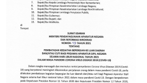 Sumutcyber.com, Jakarta-Pemerintah melalui Kementerian Pendayagunaan Aparatur Negara dan Reformasi Birokrasi (PANRB) telah menerbitkan Surat Edaran (SE) pembatasan mobilitas dan cuti bagi Aparatur Sipil Negara (ASN).