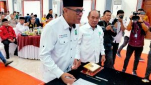Usai Deklarasi Pemilu Damai 2024, Ketua DPW PKB Sumut Sukhairi didampingi Wakil Ketua Drs Syaiful Syafri MM dan Ita Julianti yang duduk berdampingan dengan Ketua Bappilu Partai NasDem Salman Ginting dan Ketua Bidang Hukum Syarwani, SH, MH, menandatangani naskah Deklarasi di hadapan Kapolda Sumut Irjen Pol Agung, unsur Forkopimda Sumut dan Ketua KPU Herdensi S.Sos, M.Sp serta Ketua Bawaslu Sumut M. Aswin Diapari Lubis.