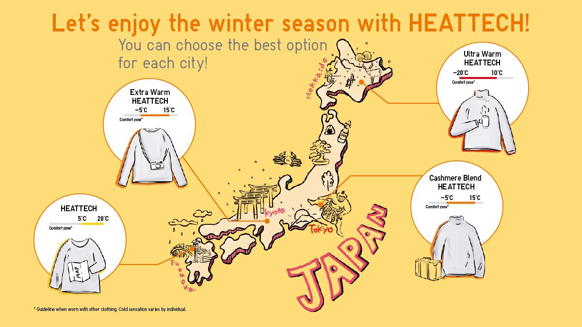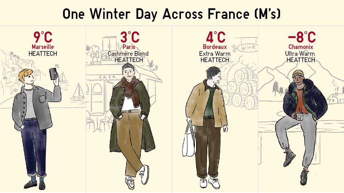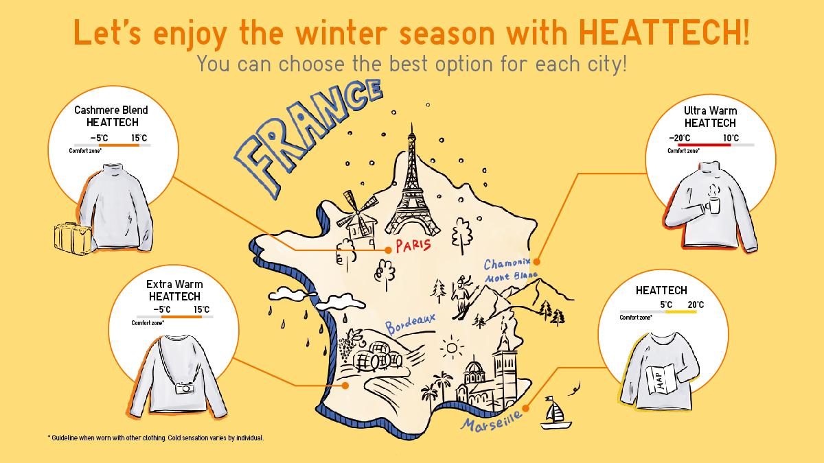 Musim dingin tidak seragam. Bahkan dalam satu negara pun, suhu antar kota tidak selalu sama. Karena itu, ilustrasi peta Jepang dan Prancis ini dibuat untuk membantu traveler menentukan HEATTECH secara lebih akurat berdasarkan tempat yang akan Anda kunjungi.