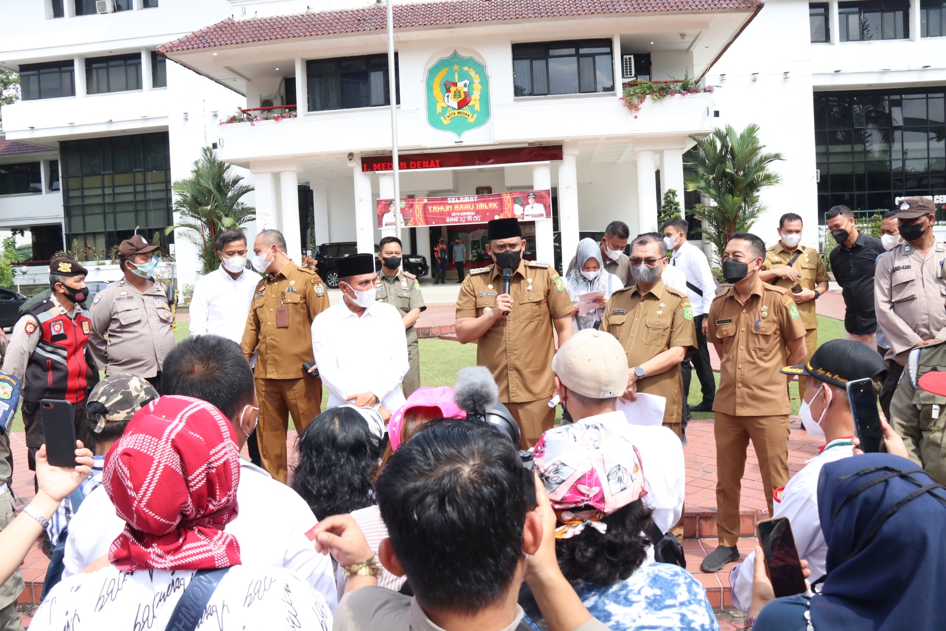Sumutcyber.com, Medan – Wali Kota Medan Bobby Nasution menemui aksi damai puluhan pedagang yang tergabung dalam Aliansi Pedagang Pasar Seluruh Indonesia (APPSINDO) Kota Medan di depan Balai Kota Medan, Senin (31/1/2022).