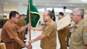 Kepala Badan Pengelola Pendapatan Daerah (Bapenda) Kabupaten Asahan Drs. Sorimuda Siregar, pada kegiatan Penyerahan SPPT PBB. P2 Tahun 2023, Tunggul dan Piagam Penghargaan PBB. P2 Tahun 2022 se-Kabupaten Asahan di Aula Melati Kantor Bupati Asahan, Selasa 21/03/2023.