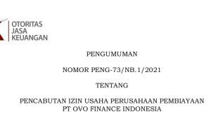 Otoritas Jasa Keuangan melalui Keputusan Dewan Komisioner Otoritas Jasa Keuangan Nomor KEP-110/D.05/2021 tanggal 19 Oktober 2021 telah mencabut izin usaha Perusahaan Pembiayaan PT OVO Finance Indonesia yang beralamat di Gedung Lippo Kuningan Lantai 17 Unit D, Jalan HR. Rasuna Said Kav. B-12 RT. 017 RW. 07, Karet Kuningan, Setiabudi, Jakarta Selatan, 12940. Pencabutan izin usaha tersebut berlaku sejak Surat Keputusan Dewan Komisioner Otoritas Jasa Keuangan pada tanggalditetapkan.