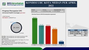 Terkait progress pencapaian UHC, Khoiruddin menyampaikan, per April 2022 dari 2.525.077 jiwa penduduk Medan, sebanyak 2.155.806 jiwa atau 85,36 persen yang telah tercover BPJS. Artinya, ada 369.871 atau 14,64 persen lagi yang belum tercover.