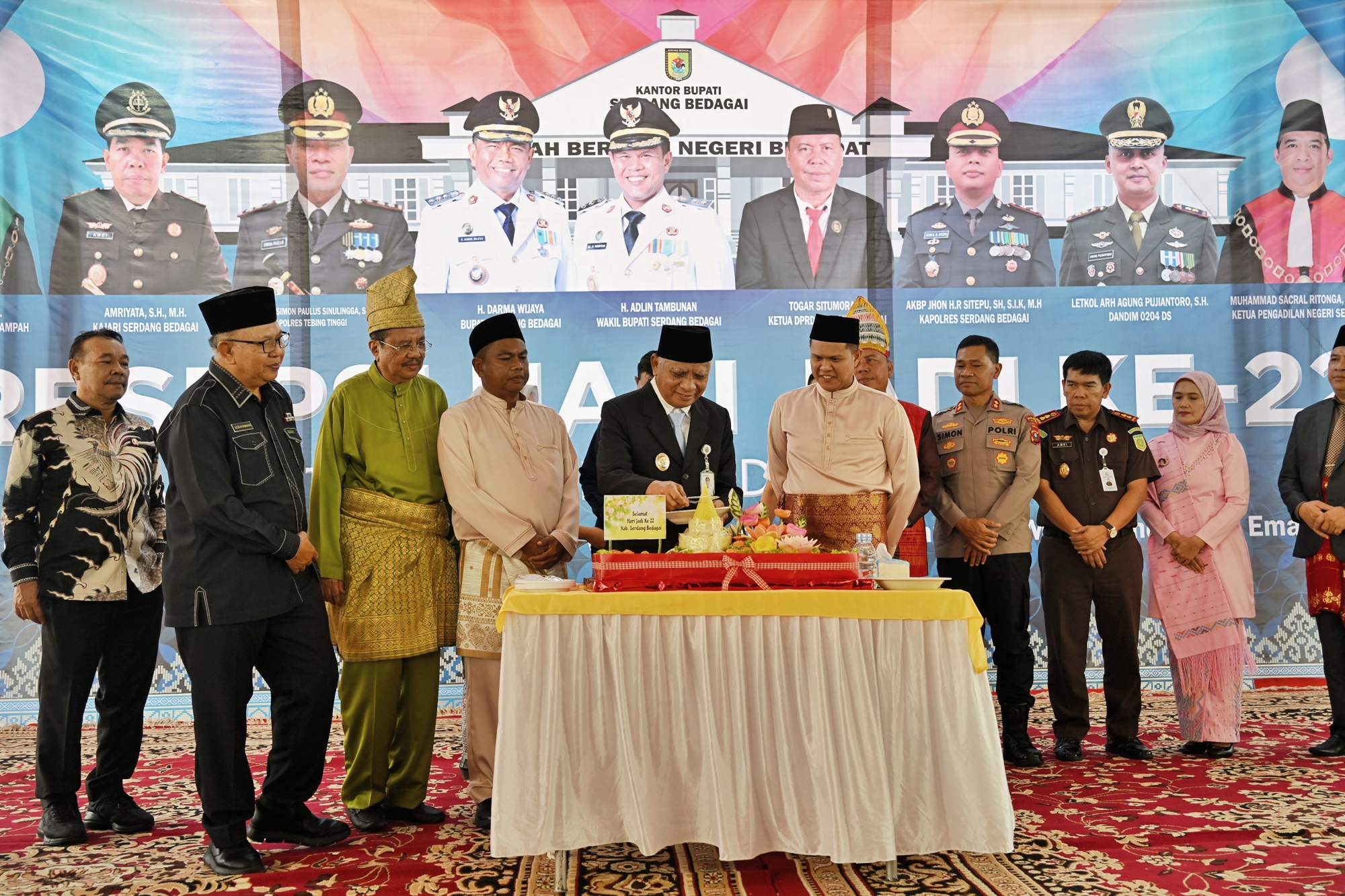 Resepsi perayaan Hari Jadi ke-22 Kabupaten Sergai ini juga ditandai dengan prosesi pemotongan tumpeng bersama tokoh masyarakat, Forkopimda, Wakil Bupati Sergai Adlin Tambunan, anggota DPRD, serta para mantan pejabat yang pernah berjasa membangun Tanah Bertuah Negeri Beradat tersebut. (SC02)