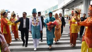 Sumutcyber.com, Deliserdang – Tiba dari Jakarta, Pj Gubernur Sumatera Utara (Sumut) Hassanudin bersama Pj Ketua TP PKK Sumut Dwiannie Dessy dan rombongan mendarat di Bandara Internasional Kualanamu, Deliserdang, Selasa (5/9/2023) sore. Kepadanya dikalungkan bunga dan dipakaikan kain khas Melayu (Sampin dan Tengkuluk).