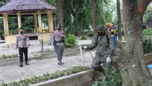 Pelaksanakan penyemprotan cairan disinfektan diawali dengan apel bersama yang dipimpin oleh Kapolres Pematangsiantar AKBP Boy Sutan Binanga Siregar SIK, melalui Kasubbag Dal AKP Masku Sembiring.
