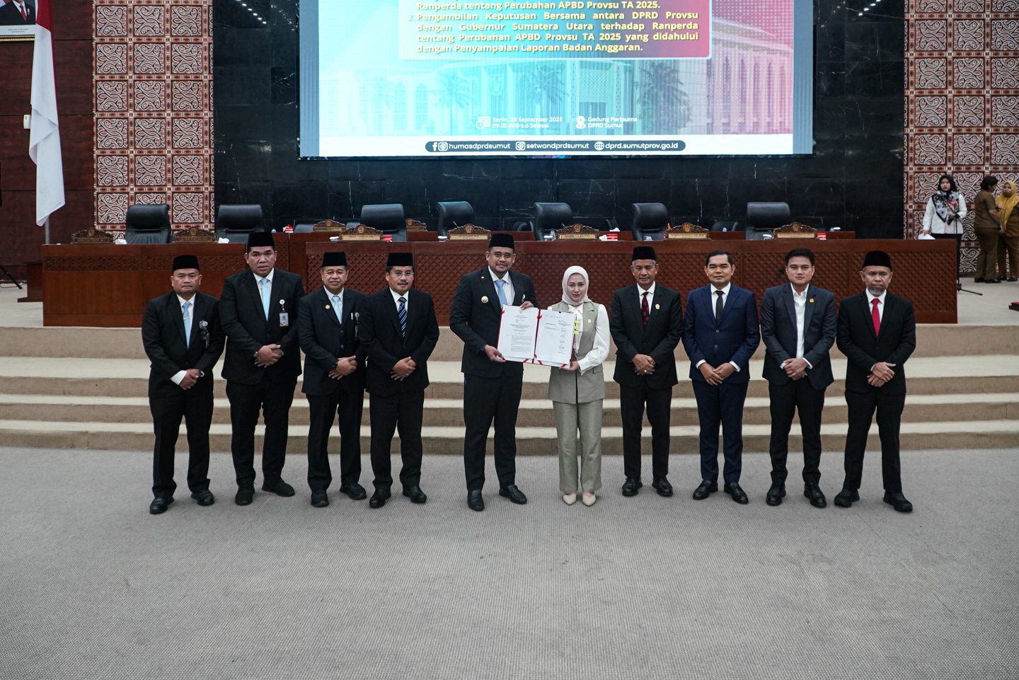 Persetujuan P-APBD 2025 tersebut ditandai dengan penandatanganan persetujuan bersama oleh Gubernur Sumut Bobby Nasution dan Ketua DPRD Sumut Ketua DPRD Sumut Erni Aryanti, setelah mendengarkan pendapat akhir seluruh fraksi-fraksi di DPRD Sumut.