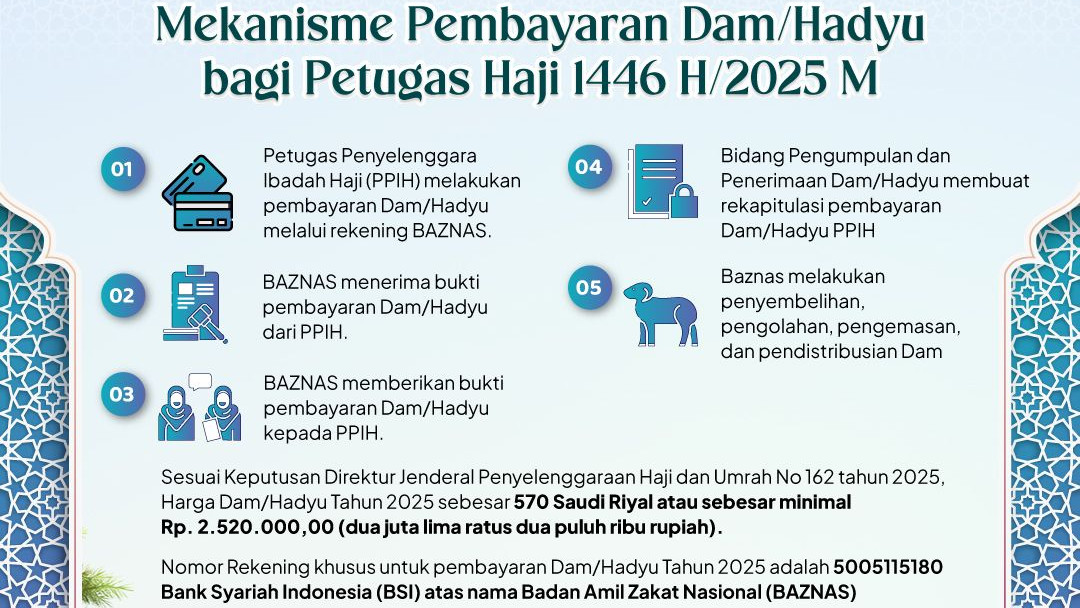 Kementerian Agama telah menerbitkan Keputusan Menteri Agama (KMA) yang mengatur mekanisme pembayaran Dam/Hadyu pada operasional haji 1446 H/2025 M. Dalam KMA No 437 Tahun 2025 tentang Pedoman Tata Kelola DAM/Hadyu antara lain diatur mekanisme pembayaran Dam/Hadyu baik untuk petugas maupun jemaah haji tahun ini.