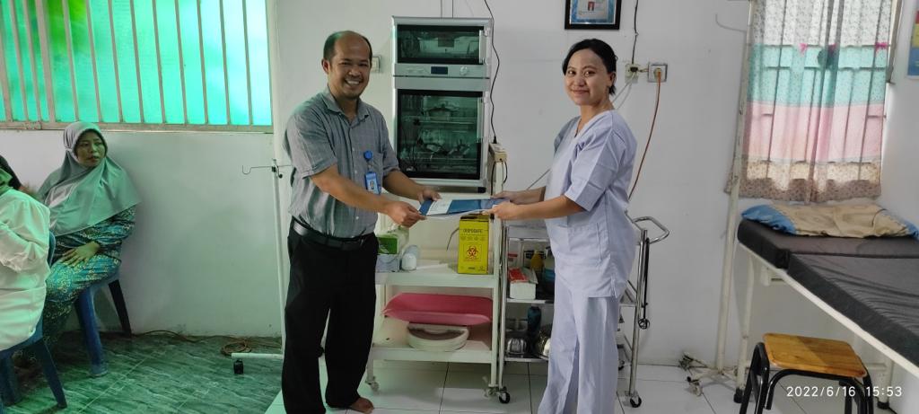 Peningkatan pelayanan berikutnya yang dialkukan melalui program pengabdian ini adalah dengan memberikan peralatan pendukung kesehatan. Adapaun alat yang diberikan adalah Sterilisator alat kesehatan, Meja instrument 3 rak stainless, Bed Gynecology serta thermometer digital dengan sanitizer.