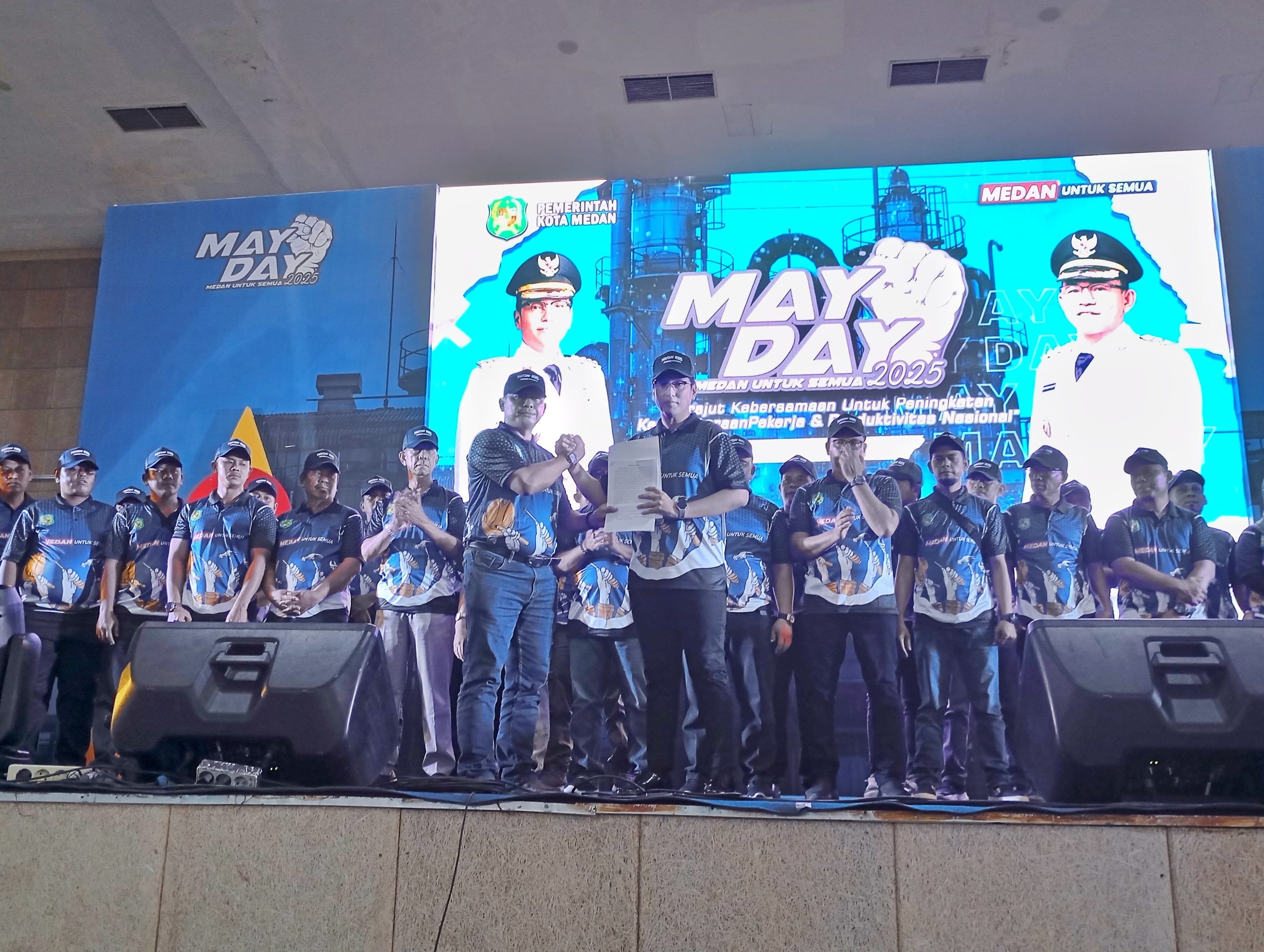 Medan – Wali Kota Medan Rico Waas menghadiri peringatan May Day di Pardede Hall, Kamis (1/5/2025). Rico Tri Putra Bayu Waas menyambut baik apa yang disampaikan para buruh dan akan memperjuangkannya.